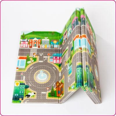 Tappeto Gioco Double-Face (città/zoo) con disegni interattivi che coinvolgono il bambino in un gioco immaginario.