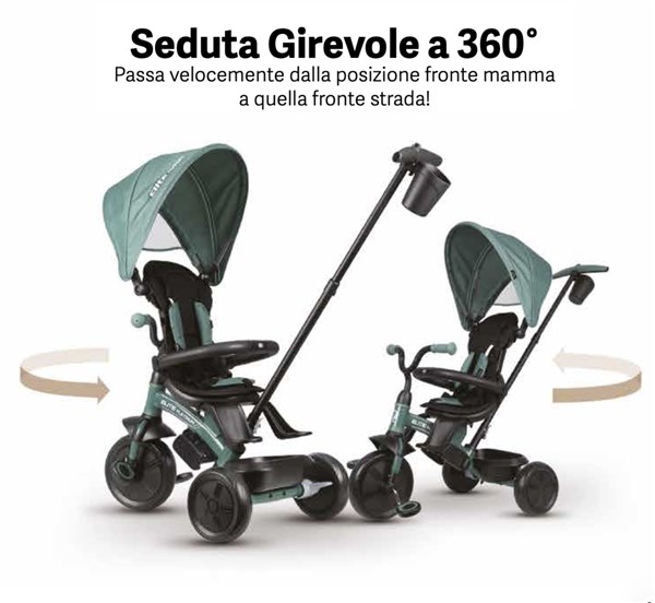 SEDUTA GIREVOLE 360° + MANIGLIONE GENITORE REGOLABILE Il seggiolino ruota 360 gradi per cambiare direzione facilmente e il maniglione telescopico garantisce controllo e comfort ai genitori nel guidare.