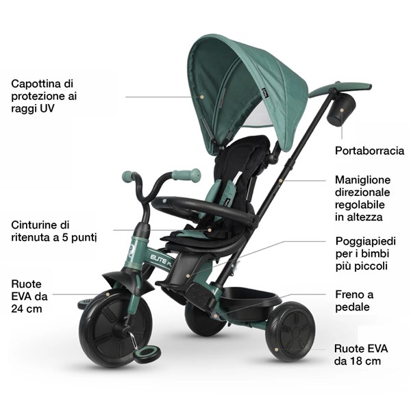 TRICICLO 6-IN-1 QPLAY ELITE PLATINUM – CRESCE CON IL BAMBINO Il Qplay Elite Platinum offre sei modalità di utilizzo, accompagnando i bambini dai 10 mesi fino a 72 mesi, per una soluzione che evolve con loro.